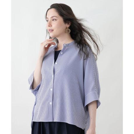 ストライプの視覚効果でスッキリ見えが叶うブラウスです。フロントはクロップド丈、バックはヒップがやや隠れる丈で、程よく体型カバーしながら涼しい着心地です。落ち感の良いサラリとした肌触りでシワになりにくく、スカートやパンツにも合わせやすい着回しの効くシンプルなデザインです。※ウォッシャブル可