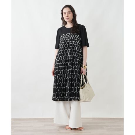 繊細で細かなプリーツが施されたワンピースです。無地部分はマットな表面感のジョーゼット素材を使用し、プリント部分は軽く清涼感のある素材を使用しています。グラデーションのサークル柄を半円状にプリントし、プリーツをかける事で上から下へ柄が広がっている様に見える、パターンを計算して作られたデザインです。※ウォッシャブル可