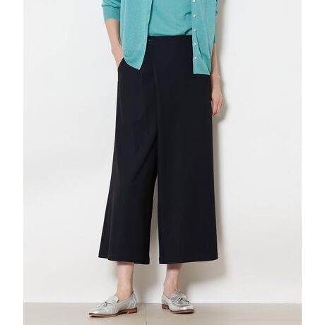 前身頃にタックを施したアシンメトリーデザインが特徴のガウチョパンツ。ラップ風のディテールがスタイリングにニュアンスをプラスし、下半身のラインを拾いにくいシルエットに仕上げました。後ろウエストはゴム仕様で快適な穿き心地。オフィススタイルからデイリーまで、幅広いシーンで活躍するきれいめボトムです。裏地なし。ポケットあり。