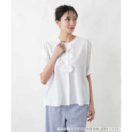カーディガン感覚でさらりと羽織れる、半袖のノーカラーブラウス。無地のように見えて、実は表情豊かな織り地が特徴で、シンプルながらもこなれた印象を与えます。柔らかなラウンドネックが、デコルテを優しく見せ、女性らしい雰囲気をプラス。夏の冷房対策や、日差しよけとしても重宝する便利な一枚です。ご自宅でお手入れできるイージーケア素材なので、汗ばむ季節にも気兼ねなくお使いいただけます。ワンピースの上に重ねたり、タンクトップの上に羽織ったりと、レイヤードスタイルを軽やかに楽しめます。