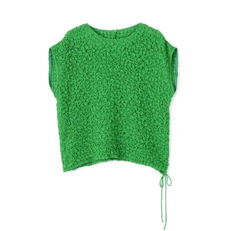 下糸にゴム糸を用いた特殊な格子状ステッチが、生地に自然なギャザーと立体的なふくらみをプラス、透け感の中に奥行きのある表情を生み出し、身体のラインを優しくぼかしながら優雅な陰影を演出します。