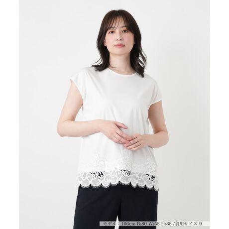「BOURGE」が提案する、裾に贅沢なレースをあしらったレイヤード風のデザインが目を惹くカットソーです。クリーンな身頃の裾から覗く繊細なレースの透け感がドラマチックな華やぎを演出。肩のラインを品よく覆うフレンチスリーブが女性らしい柔らかなシルエットを描きつつ、洗練された抜け感を醸し出します。肌離れの良いさらりとしたコットンの素材感が心地よく、一枚でスタイリングの主役になる華やかな佇まいに。日常のコーディネートをモダンに格上げしてくれる、これからの季節にふさわしいトップスです。