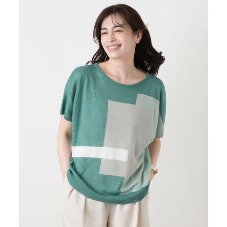 大胆なカラーブロック柄が目を惹く、「HAND」のクルーネックニットです。清涼感のある麻素材を使用しており、さらりとした肌触りで汗ばむ季節も快適な着心地をキープします。フロントに配したモダンな幾何学模様が都会的でアーティスティックなニュアンスをプラス。程よくゆとりのあるシルエットと五分袖のデザインが気になるラインをカバーしつつ、リラックスした大人の抜け感を演出します。一枚でスタイリングの主役になる、遊び心と洗練さを兼ね備えた贅沢なアイテムです。