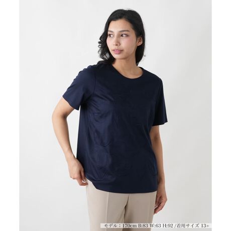 身頃に施された植物の模様が、光の角度によってさりげなく浮かび上がります。なめらかな生地は、ほどよくゆとりのあるシルエットに美しい落ち感を与えます。すっきりとしたクルーネックが顔周りを品良く見せ、一枚ではもちろん、羽織りもののインナーとしても映える一着です。