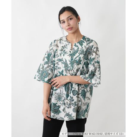 イタリアの老舗「RATTI」社が手掛けた、芸術的なペイズリープリントが魅力のプルオーバーブラウス。薄手で風合いの良いコットンボイル素材を使用しており、軽やかで心地よい着用感です。繊細な柄と美しい色使いは、まさに「RATTI」社ならでは。一枚で主役になる華やかさを持ちながら、どこか落ち着いた品格が漂います。すっきりとした襟元と七分袖のデザインが、抜け感と女性らしさを演出。ご自宅での手洗いも可能で、お手入れのしやすさも魅力です。シンプルなスカートやパンツと合わせるだけで、上質を知る大人のための、洗練された装いが完成します。