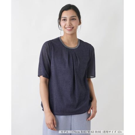 夏の装いを上品に彩る、パワーネット素材の半袖カットソー。繊細な透け感と、無地ライクながらも豊かな表情を持つ素材が、シンプルながらも存在感のある一枚です。透け感はあるのですが、前身ごろの裏側にチュールがはりつけられております。すっきりとした半袖と、デコルテをきれいに見せるノーカラーの丸首デザインが、涼やかで女性らしい印象を演出。ジャケットやカーディガンのインナーとしてもかさばらず、快適な着心地です。ご自宅でお手入れしやすいのも嬉しいポイント。週末のお出かけやご旅行など、様々なシーンで活躍します。