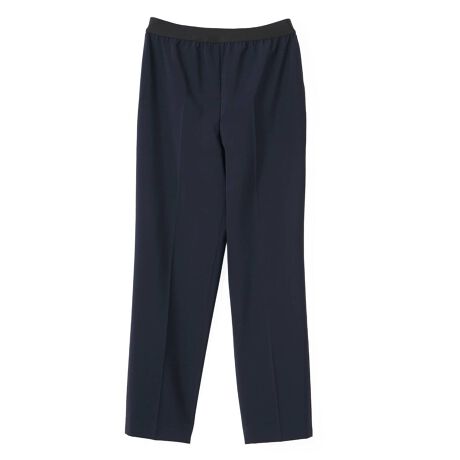 ポリエステルやレーヨンにストレッチ素材をブレンドし、驚くほど滑らかで快適な穿き心地を実現したテーパードパンツ。接触冷感機能を備えているため、気温が上がる季節でも肌に触れるたび涼しく清涼感をキープ。足首に向かって細くなるテーパードシルエットとセンタープレスが、レッグラインを美しくシャープに演出。ウエストは総ゴム仕様でリラックス感を高めつつ、ベルト部分の配色切り替えがデザインのアクセントとなり、トップスインのスタイルもスマートに決まる一本です。