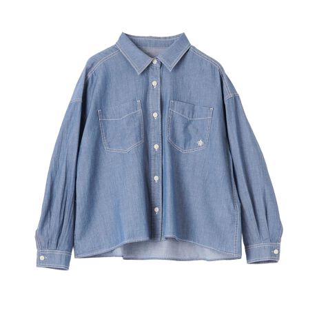 インディゴの風合いを活かしたデニム生地に製品洗いを施し、柔らかく肌馴染みの良い質感に仕上げたオーバーサイズのブラウス。ゆったりとしたシルエットとドロップショルダーがリラックス感のあるスタイリングを後押しします。左胸のポケットにはロゴ刺繍がアクセントとしてあしらわれ、ワークテイストの中にブランドらしい個性をプラス。前後の着丈に差をつけた裾のデザインは、一枚着としてはもちろん、軽めの羽織りとしてもバランスよく決まる着回し力の高いアイテムです。