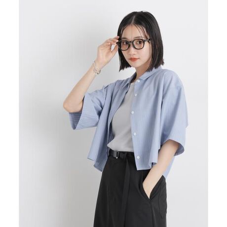 配色カラーが大人可愛い、ストライプ柄の半袖シャツ。そこまで短くないクロップド丈なので色んなボトムとも合わせやすく、スタイリングのポイントになってくれるアイテムです。