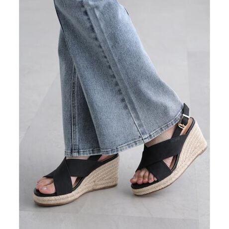 ジュート巻きのウェッジソールが夏らしいサンダル。甲はクロスデザインでしっかりホールドし、歩きやすくなっています。ヒールは高めながらウェッジソールで安定感があり、疲れにくいのも嬉しいポイント。ラクに履けてキレイ見えとスタイルアップを叶える、シンプルで洗練された一足です。※モデルの着用画像の場合、光の当たり具合により、実際の色味と異なって見えることがございます。色味は、商品単体の画像をご参照ください。