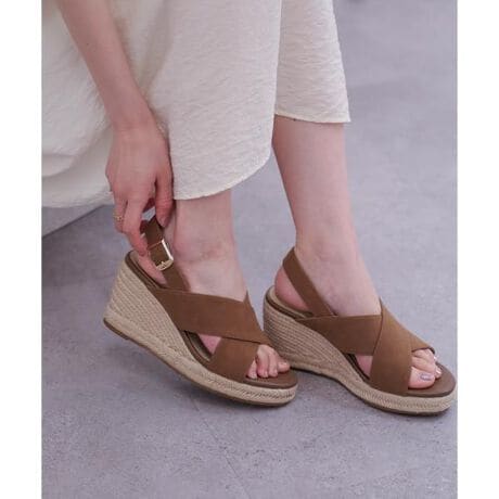 ジュート巻きのウェッジソールが夏らしいサンダル。甲はクロスデザインでしっかりホールドし、歩きやすくなっています。ヒールは高めながらウェッジソールで安定感があり、疲れにくいのも嬉しいポイント。ラクに履けてキレイ見えとスタイルアップを叶える、シンプルで洗練された一足です。※モデルの着用画像の場合、光の当たり具合により、実際の色味と異なって見えることがございます。色味は、商品単体の画像をご参照ください。