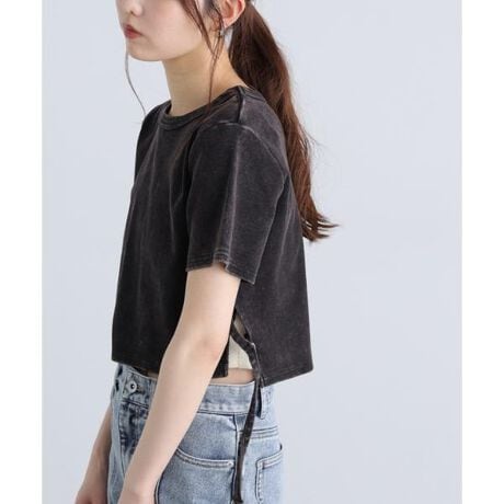 昨年好評だったヴィンテージ加工サイドベルトTが今年も登場!サイドのベルトディテールが抜け感バツグンなTシャツです。リブカットソーに硫化で製品染めした後、パウダー加工を施した1枚。両サイドのスリットに共地のDカンベルトを付け、抜け感とインパクトのあるデザインに。コンパクトなサイズなので、ワイドデニムやチュールスカートのようなボリュームボトムと合わせてヘルシーに着こなすのがオススメです。※モデルの着用画像の場合、光の当たり具合により、実際の色味と異なって見えることがございます。色味は、商品単体の画像をご参照ください。