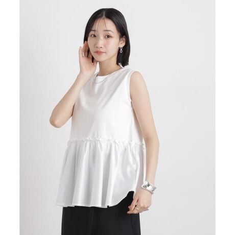 異素材コンビのデザインが一枚で主役になるドッキングトップス。たっぷり入ったギャザーのペプラムデザインが、ウエスト周りを自然にカバーしてくれるのも嬉しいポイント。ジャケットやカーディガンに合わせたり、クロップド丈のトップスとレイヤードさせたりと、ロングシーズン重宝するアイテムです。