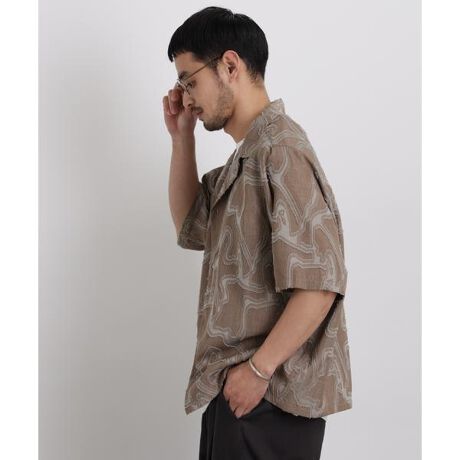 落ち着いた色でまとめた総柄シャツ。糸を引いたり毛足を出したりなどを施し柄を表現する、特徴的な生地を使用した一枚。ポリエステル100%なので洗濯しても乾きやすく、これからの季節におすすめの1枚です。