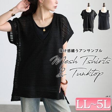 メッシュ生地のカットソーと、タンクトップがセットになったアンサンブルアイテム。セットでも、別々でも楽しめるからコーデの幅も広がります。メッシュ生地のカットソーは、重ねるだけで自然と奥行きが生まれ、トレンドライクなこなれ感を演出する垢抜けアイテム。ベーシックなタンクトップは程よいゆとりですっきりとしたシルエット。レイヤードにもぴったりなサイジングで着回し力も高く、ゆったりとしたメッシュカットソーは深めのVネックで顔周りをすっきりさせ、抜け感をプラス。テールヘムでさり気なくヒップラインまで体型カバー。