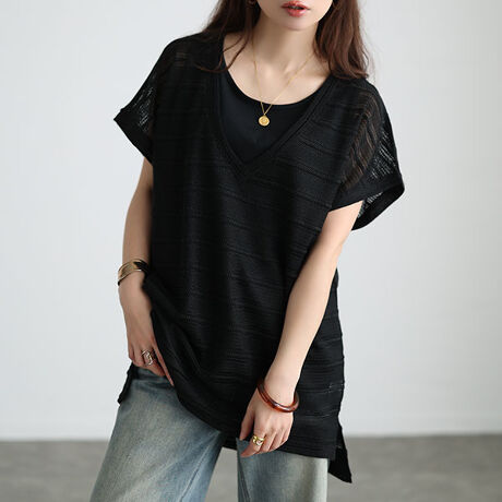 メッシュ生地のカットソーと、タンクトップがセットになったアンサンブルアイテム。セットでも、別々でも楽しめるからコーデの幅も広がります。メッシュ生地のカットソーは、重ねるだけで自然と奥行きが生まれ、トレンドライクなこなれ感を演出する垢抜けアイテム。ベーシックなタンクトップは程よいゆとりですっきりとしたシルエット。レイヤードにもぴったりなサイジングで着回し力も高く、ゆったりとしたメッシュカットソーは深めのVネックで顔周りをすっきりさせ、抜け感をプラス。テールヘムでさり気なくヒップラインまで体型カバー。