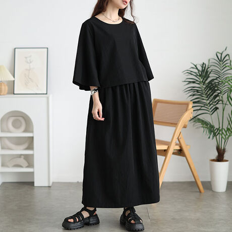 大胆なスリーブが印象的なラフな雰囲気漂うセットアップ。上下セットだからコーデのお悩みを解消し、瞬時にワントーンコーデが完成。接触冷感機能付きだから、汗ばむ季節もひんやりと心地の良い着心地が嬉しいセット。セットでも別々でも楽しめるからコーデの幅も広がります。フレア感のあるオーバースリーブは二の腕をカバーしながら細見えに。スリット入りだから、モタつきを抑え、抜け感をプラスします。クロップド丈ですっきりとボトムスとの相性も抜群。ウエストゴムのAラインスカートでストレスフリー&スタイリッシュに大人っぽさを演出します。