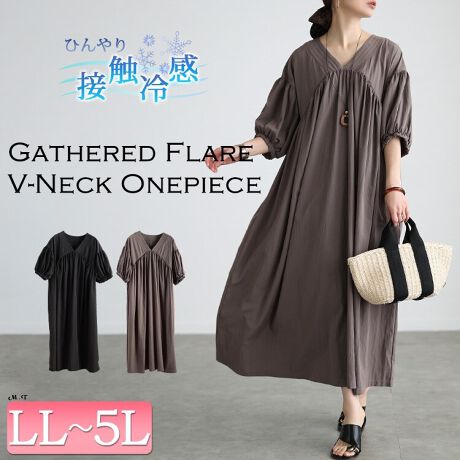 【大きいサイズ】 接触冷感ギャザー切り替えフレアワンピース 大きいサイズ レディース ワンピース