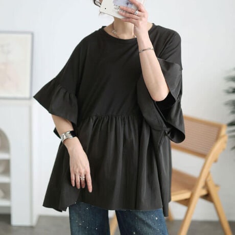 何気ない動きがドラマティックに映える♪接触冷感異素材切り替えワイドチュニック登場!汗ばむ季節も冷んやり快適な接触冷感素材◎体型を覆い隠すワイドシルエットでこなれ感のある落ち感◎二の腕を華見せするフリルショルダーとラフなドロップショルダーで楽ちんな着心地なのもオススメポイント☆シンプルになりがちな夏コーデもインパクトのあるサイジングで簡単に印象チェンジ♪カジュアルコーデに取り入れやすい大人可愛い一着です!