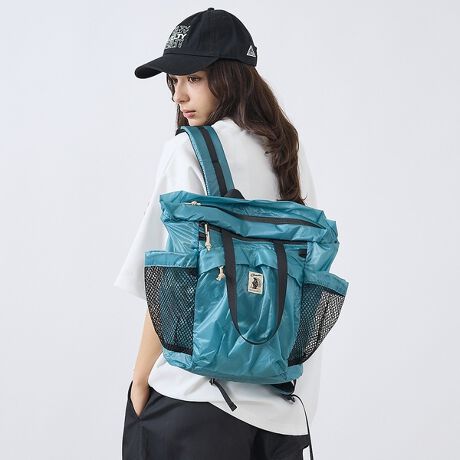 収納性と軽さが特徴のトート型バックパックです。フロントポケットとサイドポケットを備え、開口部は止水ジッパー仕様で防水性を高めています。フリーサイズで使いやすく、サックスカラーがコーディネートのアクセントになります。