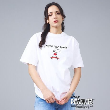 1975年誕生のロングセラー、BEEFY-T?初のアートプリント企画。胸元には「TOUGH AND FUNNY」のメッセージと、スケートボードに乗るJOE COOLのスヌーピーをプリントしています。アメリカンテイストを感じさせるクラシックなボックスシルエットで、BEEFY-T?らしいタフな存在感が魅力です。