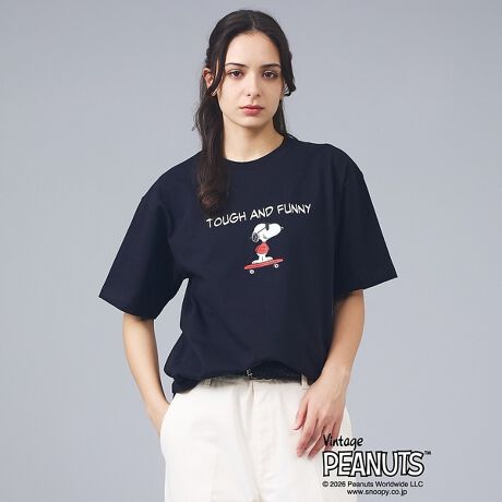 1975年誕生のロングセラー、BEEFY-T?初のアートプリント企画。胸元には「TOUGH AND FUNNY」のメッセージと、スケートボードに乗るJOE COOLのスヌーピーをプリントしています。アメリカンテイストを感じさせるクラシックなボックスシルエットで、BEEFY-T?らしいタフな存在感が魅力です。