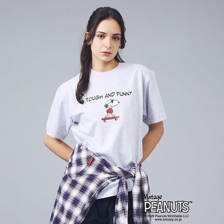 1975年誕生のロングセラー、BEEFY-T?初のアートプリント企画。胸元には「TOUGH AND FUNNY」のメッセージと、スケートボードに乗るJOE COOLのスヌーピーをプリントしています。アメリカンテイストを感じさせるクラシックなボックスシルエットで、BEEFY-T?らしいタフな存在感が魅力です。