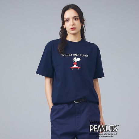 1975年誕生のロングセラー、BEEFY-T?初のアートプリント企画。胸元には「TOUGH AND FUNNY」のメッセージと、スケートボードに乗るJOE COOLのスヌーピーをプリントしています。アメリカンテイストを感じさせるクラシックなボックスシルエットで、BEEFY-T?らしいタフな存在感が魅力です。