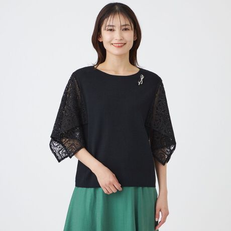 立体的なレーススリーブが印象的なニットトップスです。