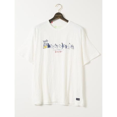 夏コーデの主役アイテムにぴったりな、クルーネックの半袖Tシャツです。アイスクリーム屋に並ぶペンギンのプリントで、涼しげなルックスに仕上げています。衿ぐりに入れたトリコロールカラーのテープがアクセントになっています。
