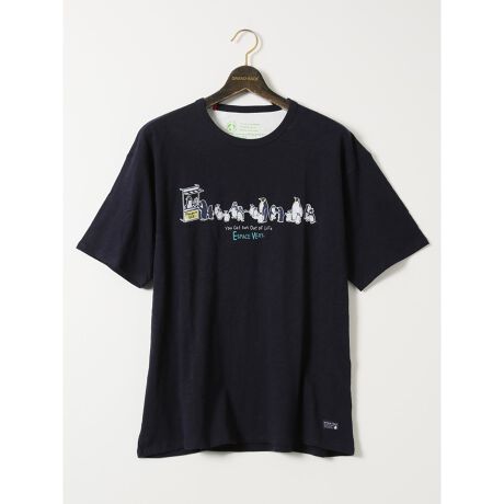 夏コーデの主役アイテムにぴったりな、クルーネックの半袖Tシャツです。アイスクリーム屋に並ぶペンギンのプリントで、涼しげなルックスに仕上げています。衿ぐりに入れたトリコロールカラーのテープがアクセントになっています。