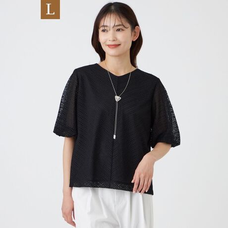 【L】【ウォッシャブル】コットンスムースレースコンビカットソー