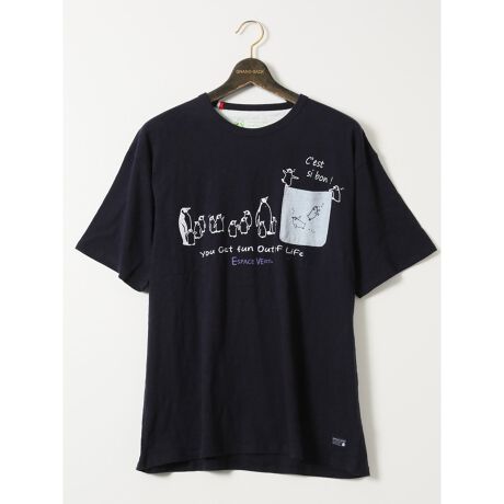 夏コーデの主役アイテムにぴったりな、クルーネックの半袖Tシャツです。ペンギンたちがポケットに飛び込む風景が楽し気なプリントで、涼しげなルックスに仕上げています。衿ぐりに入れたトリコロールカラーのテープがアクセントになっています。