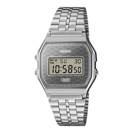 山形カシオで製造された日本製のA159をベースに、フェイスに伝統的な吉祥柄の「青海波(せいがいは)」をあしらいました。青海波は、同心円の弧が重なって波のように見える日本の伝統的な模様で、波が途切れず続くことから、幸運や穏やかな日々が長く続くよう願いが込められています。ダイアルは蒸着処理と印刷を組み合わせた上品な仕上げ。光の当たり方で控えめにきらめき、デジタル表示とのコントラストを引き立てます。