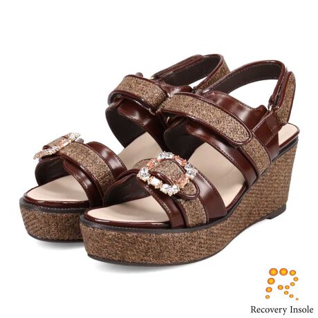 煌めくジュエルバックルと夏らしいヘルシーなラフィア調生地のエレガンスカジュアルサンダル。