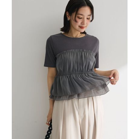 リブトップスにオーガンジー素材のビスチェを重ねたようなドッキングデザインで、トレンド感のある着こなしが手軽に楽しめます。軽やかな透け感と柔らかな風合いが、コーディネートにほどよい華やかさをプラスします。ウエスト部分の切り替えとギャザーがふんわり広がり、自然な体型カバーを叶えつつ女性らしいシルエットを演出します。半袖仕様で着心地も軽く、ロングシーズン活躍するのも嬉しいポイントです。パンツにもスカートにも合わせやすく、シンプルなボトムに合わせるだけで洗練された印象に仕上がります。日常使いからお出かけまで幅広く頼れる万能トップスです。