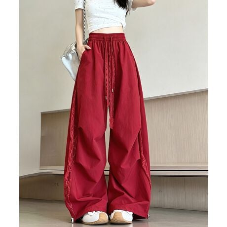 サイドレースデザインと裾ドロストがポイントのワイドパンツ。