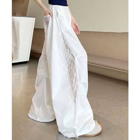 サイドレースデザインと裾ドロストがポイントのワイドパンツ。