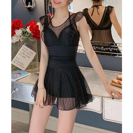 胸元や肩まわりはレースでカバーし、スカートデザインでヒップや太ももをさりげなくカバー。
