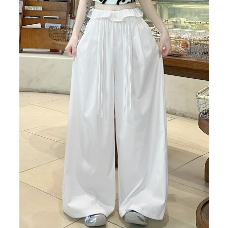 ウエストフリルで大人の抜け感をプラスするワイドパンツ。