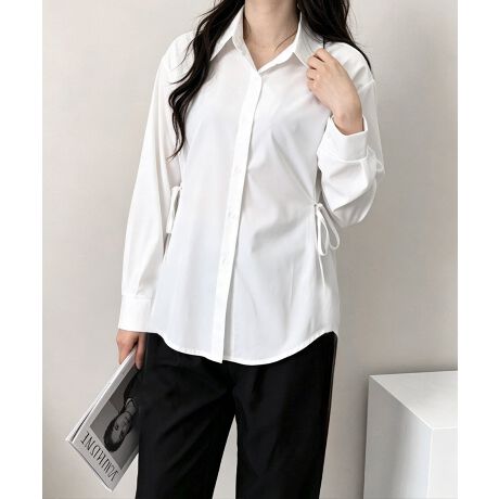 サイドリボンでウエストを美しく見せる長袖シャツブラウス。