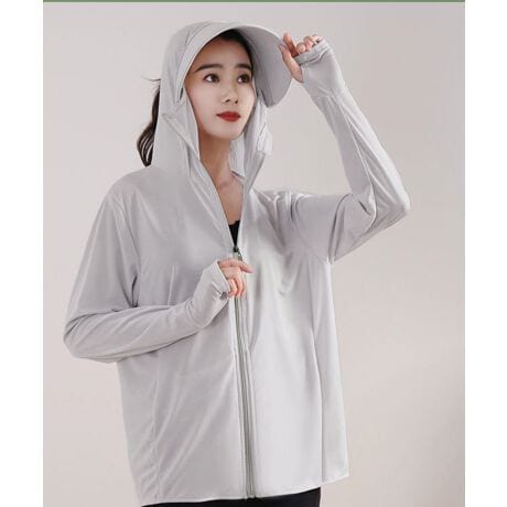 サンバイザー付きのつば広フードで、顔周りから首元までしっかりカバー。さらに指穴付きの袖口で、手の甲までしっかり日焼けを防止します。