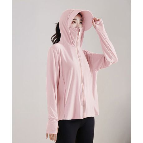 サンバイザー付きのつば広フードで、顔周りから首元までしっかりカバー。さらに指穴付きの袖口で、手の甲までしっかり日焼けを防止します。