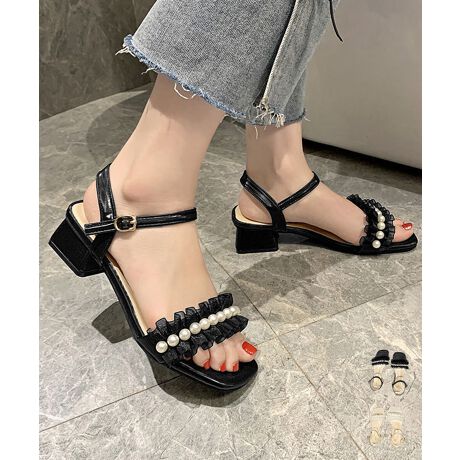 パールとフリルが華やかな、レディースオープントゥサンダル。