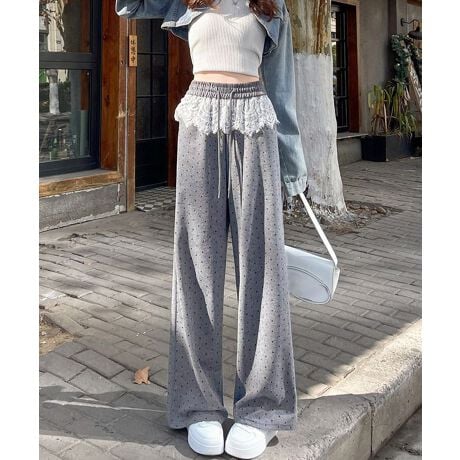 ドット柄とレースを組み合わせたワイドパンツ。