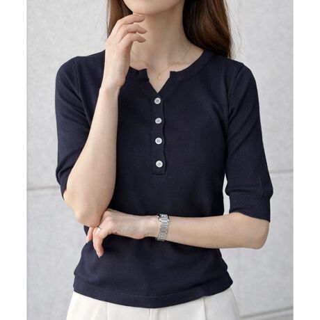 すっきりとしたネックラインとフロントボタンが、上品な印象を演出します。