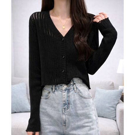通気性のある編み地で、暑い季節にも取り入れやすい一枚です。