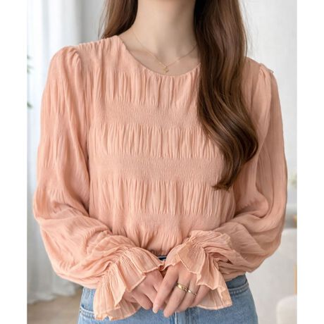 繊細なシアー素材とシャーリングが女性らしい印象を引き立てます。