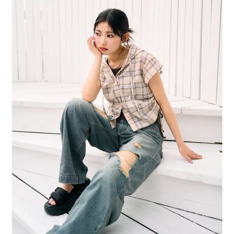 ヴィンテージライクな程よいシワ加工や、シアーチェック素材がこなれた印象を演出してくれます! 日差しが強い時期にうれしいUVカット機能つき! コンパクトな着丈で合わせるボトムスを選ばず、自然なスタイルアップが叶います。