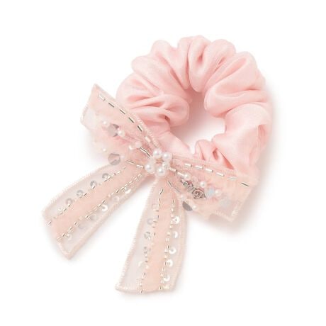 キラキラ艶めくオーガンジーで仕上げたシュシュです。きらきらのスパンコールやビーズを施したシアー素材で仕上げたリボンのワッペンをプラス。肌を出す季節には髪の毛につけるだけでなく、ブレスレットとしても活躍します。